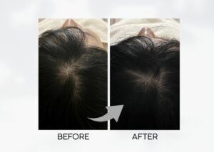 このような毛髪は頭皮環境が改善されて、色素細胞がメラニン色素を作ることができれば黒髪に戻る可能性があると言われていて、こちらの症例はまさに鍼灸で頭皮の血流が改善されたことで、色素細胞の機能が活性化したケースだと考えられます。